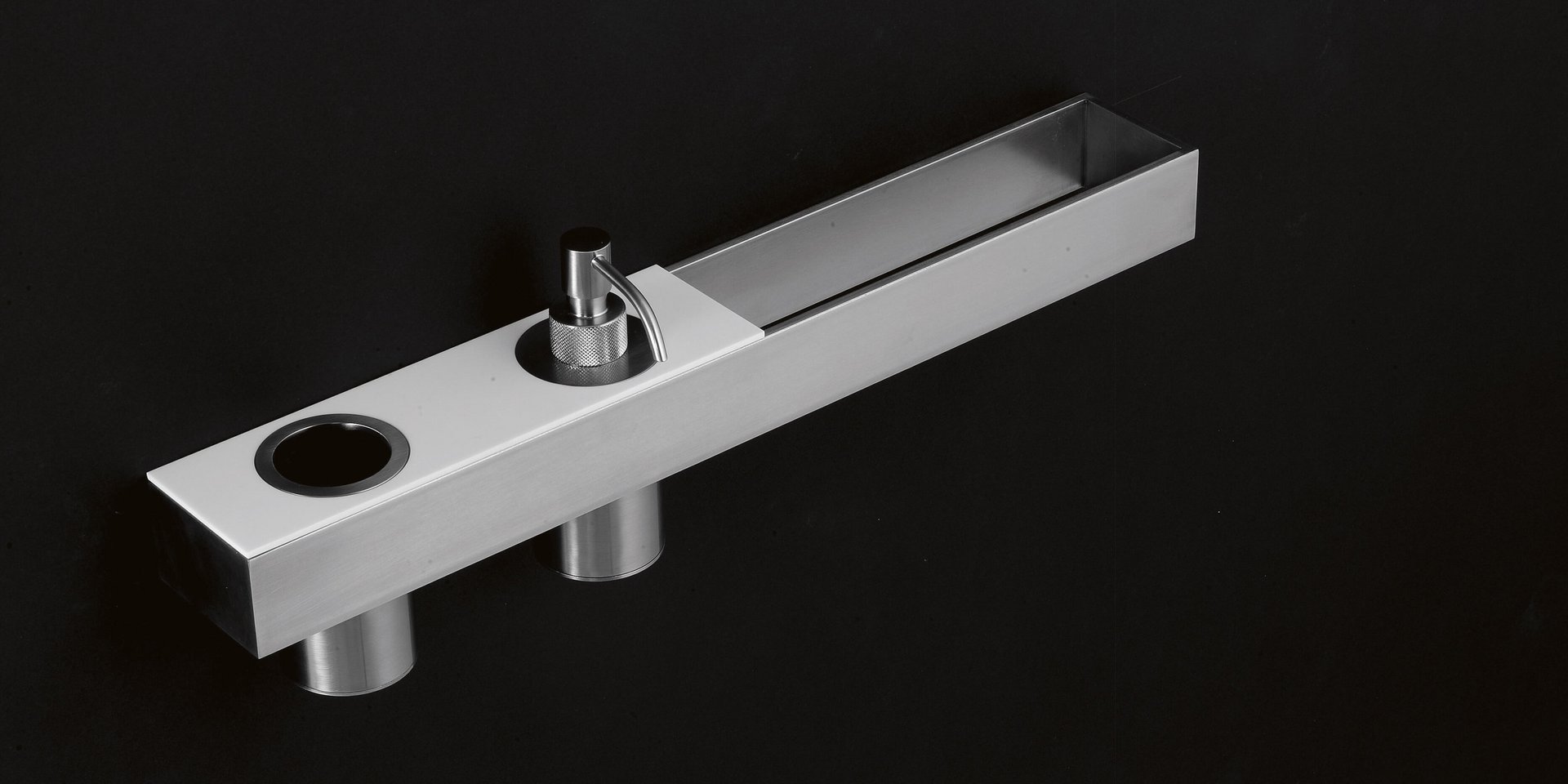 Размеры: дозатор – d.6,5 х 9,5 х 16 см; стакан – d.6,5 х 6,5 х 10,5 см; материал: нержавеющая сталь.