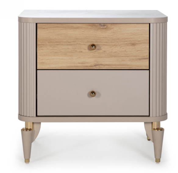 Современная модель размером 62×47×61 см с элегантными деталями. Выполнена в кремовом цвете с деревянными вставками цвета дуб. Ручки и ножки с глянцевым золотистым покрытием подчеркивают стиль коллекции.