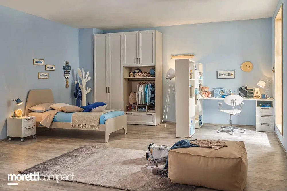 Спальня со шкафом, панельной кроватью и рабочей зоной с двухсторонним книжным шкафом. Что подразумевается под спальней Монтессори? Это означает выбор мебели, вдохновленный Марией Монтессори, целью которого является развитие самостоятельности детей путем стимулирования с помощью творческой игры. Согласно этим принципам, например, гардероб должен быть организован таким образом, чтобы дети могли самостоятельно убирать свою одежду, чтобы посредством простых повседневных действий обрести уверенность в себе и самостоятельность. Например, этот гардероб Vogue с открытым отделением и двумя ящиками внизу, к которым легко добраться даже самым маленьким в доме.