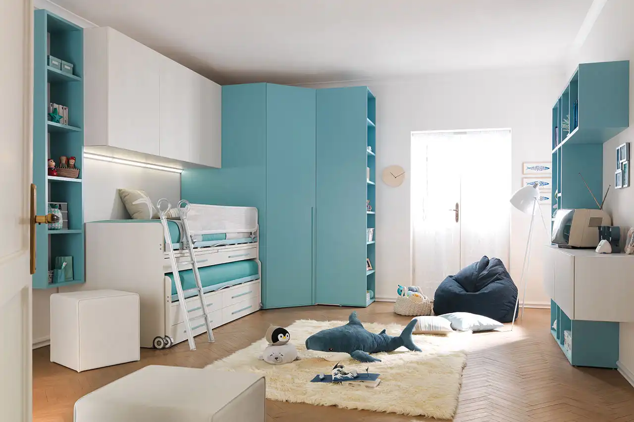 Кровать Space - это модульная система, представленная двумя спальными местами, ящиками для хранения вещей, и выдвижными письменными столами. Для верхней кровати предусмотрена откидная защита Web Split с ключом безопасности: защиту можно разблокировать, только активировав механизм фиксации, например, когда кровать нужно заправить.