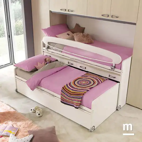 Когда в комнате недостаточно пространства, идеальным выбором станет решение выдвижной кровати Space. Это предложение состоит из двух независимых кроватей на колесиках; нижняя кровать Space скрывает третью кровать, оснащенную двумя парами металлических ножек, которые, открываясь, поднимают основание кровати на нужную высоту.