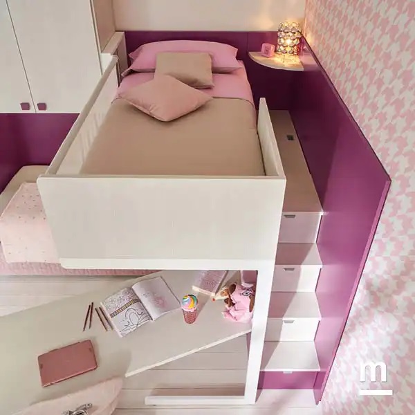 Двухъярусные кровати представляют собой лучший выбор для концентрации множества различных функций в одном пространстве. Полка с закругленным профилем — незаменимый, но очень удобный предмет мебели: она выполняет роль прикроватной тумбочки для верхней кровати и является надежной опорой для лампы или мобильного телефона.